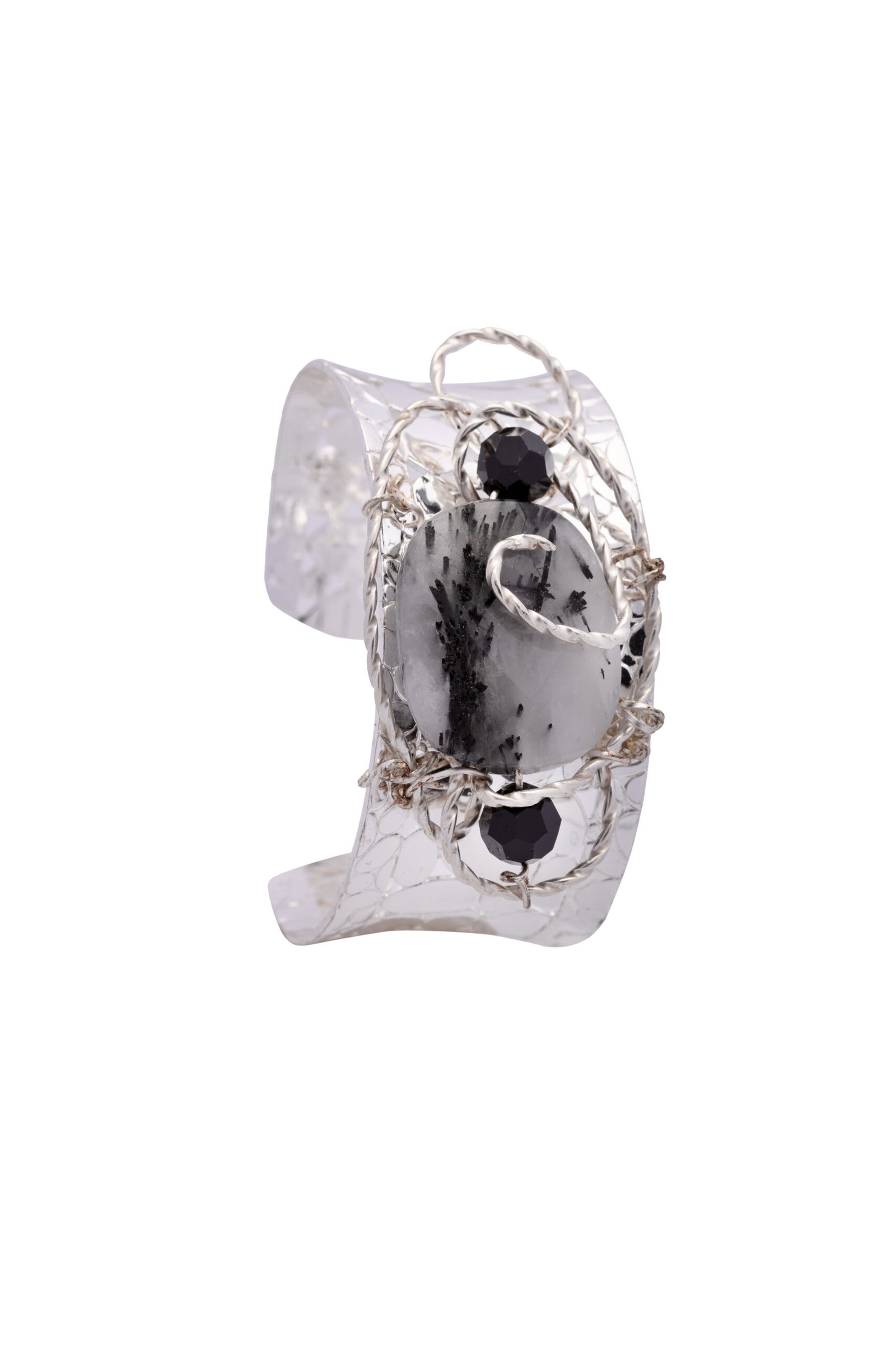 Χειροποίητη ασημένια μανσέτα με κρύσταλλα Swarovski και μαρμαροειδή ημιπολύτιμη πέτρα τυλιγμένη σε περίτεχνο ασημένιο σύρμα.