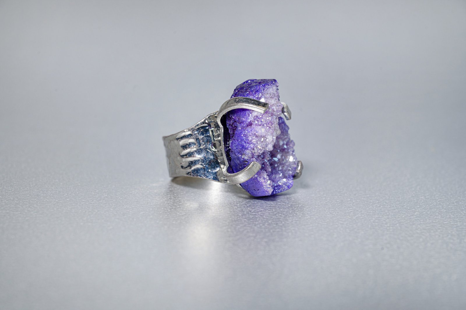 Αυτό το εντυπωσιακό δαχτυλίδι με ακατέργαστο αχάτη συνδυάζει φυσικά ανάγλυφα και μοντέρνα αισθητική, με ανοιχτή νύχια και σφυρήλατη επαργυρωμένη μπάντα.