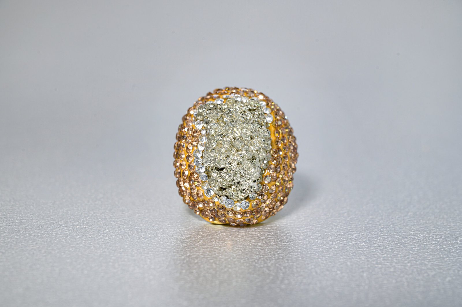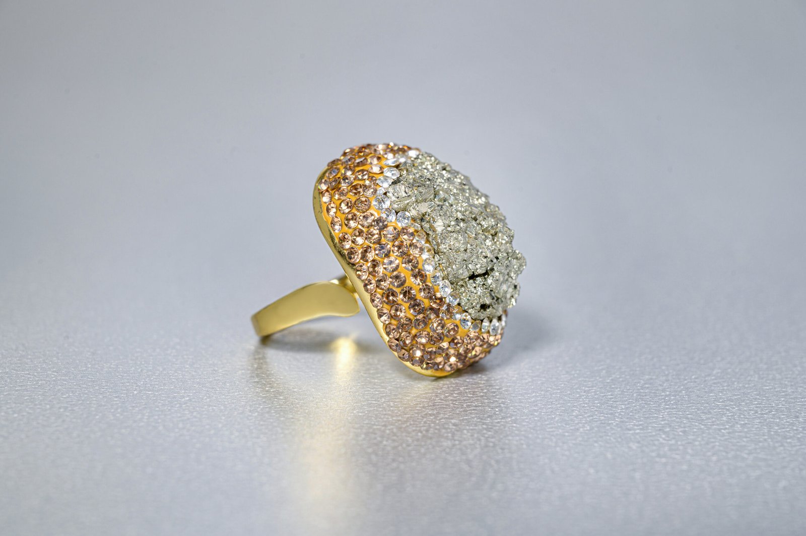Αυτό το πολυτελές επιχρυσωμένο δαχτυλίδι διαθέτει πυρήνα από ορυκτό πυρίτη και στέμμα από κρύσταλλα Swarovski που ενισχύουν τη λάμψη του.