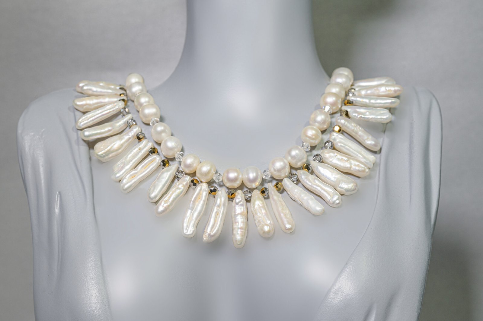 Κομψό κολιέ πολλαπλών σειρών με επιμήκη μπαρόκ μαργαριτάρια γλυκού νερού και δεύτερη σειρά από white lotus μαργαριτάρια, διαχωρισμένα με κρύσταλλα Swarovski.