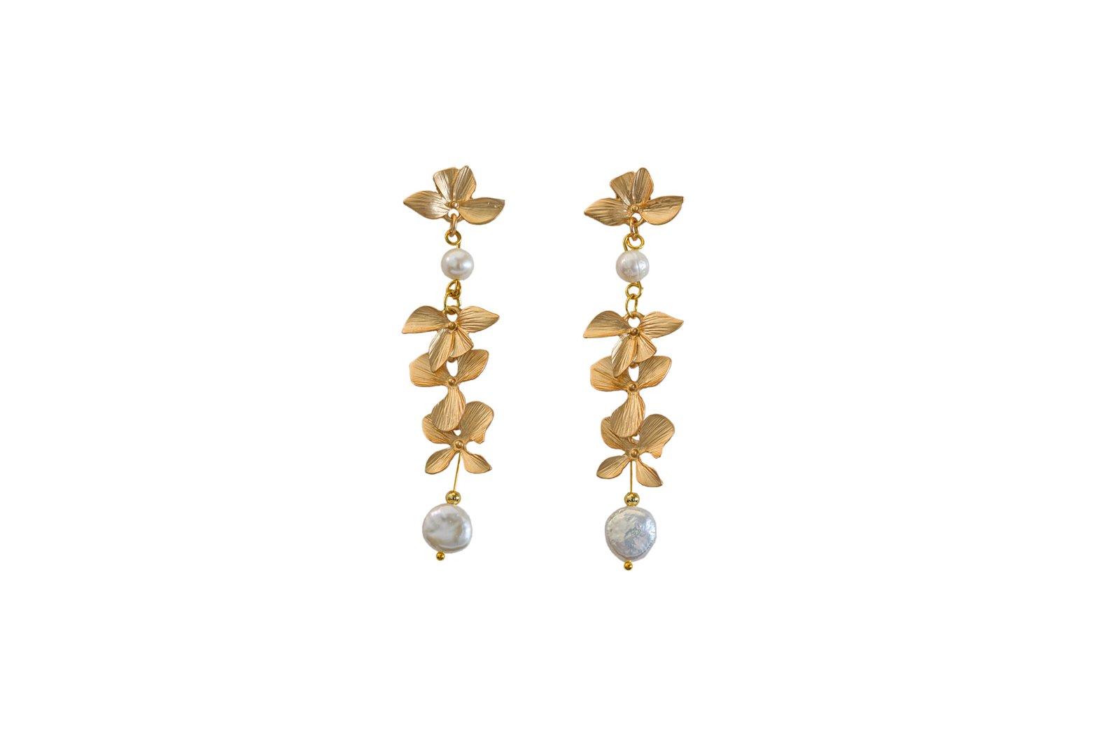 Επίχρυσα κρεμαστά σκουλαρίκια με καμπυλωτό ανθικό μοτίβο που συνδυάζει στρογγυλά και μπαρόκ μαργαριτάρια γλυκού νερού.
