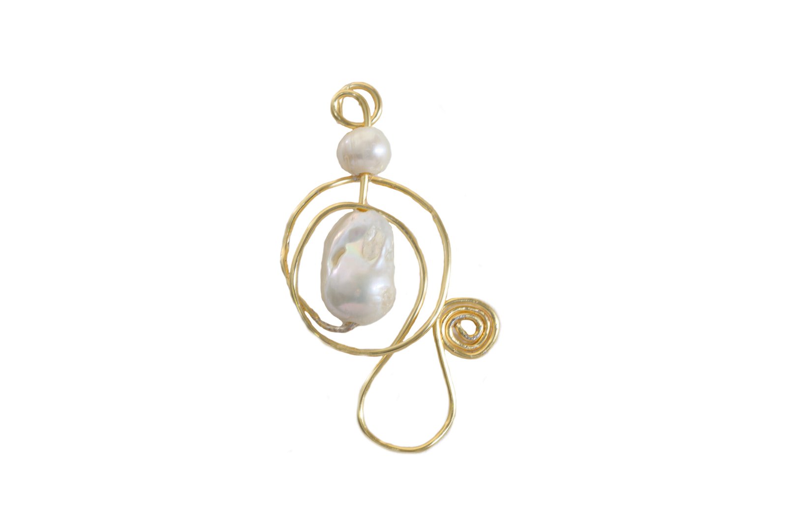 Εντυπωσιακό μενταγιόν με μπαρόκ μαργαριτάρια γλυκού νερού αγκαλιασμένα από χειροποίητη χρυσαφί συρμάτινη δομή με ασύμμετρες καμπύλες που θυμίζουν γλυπτό.
