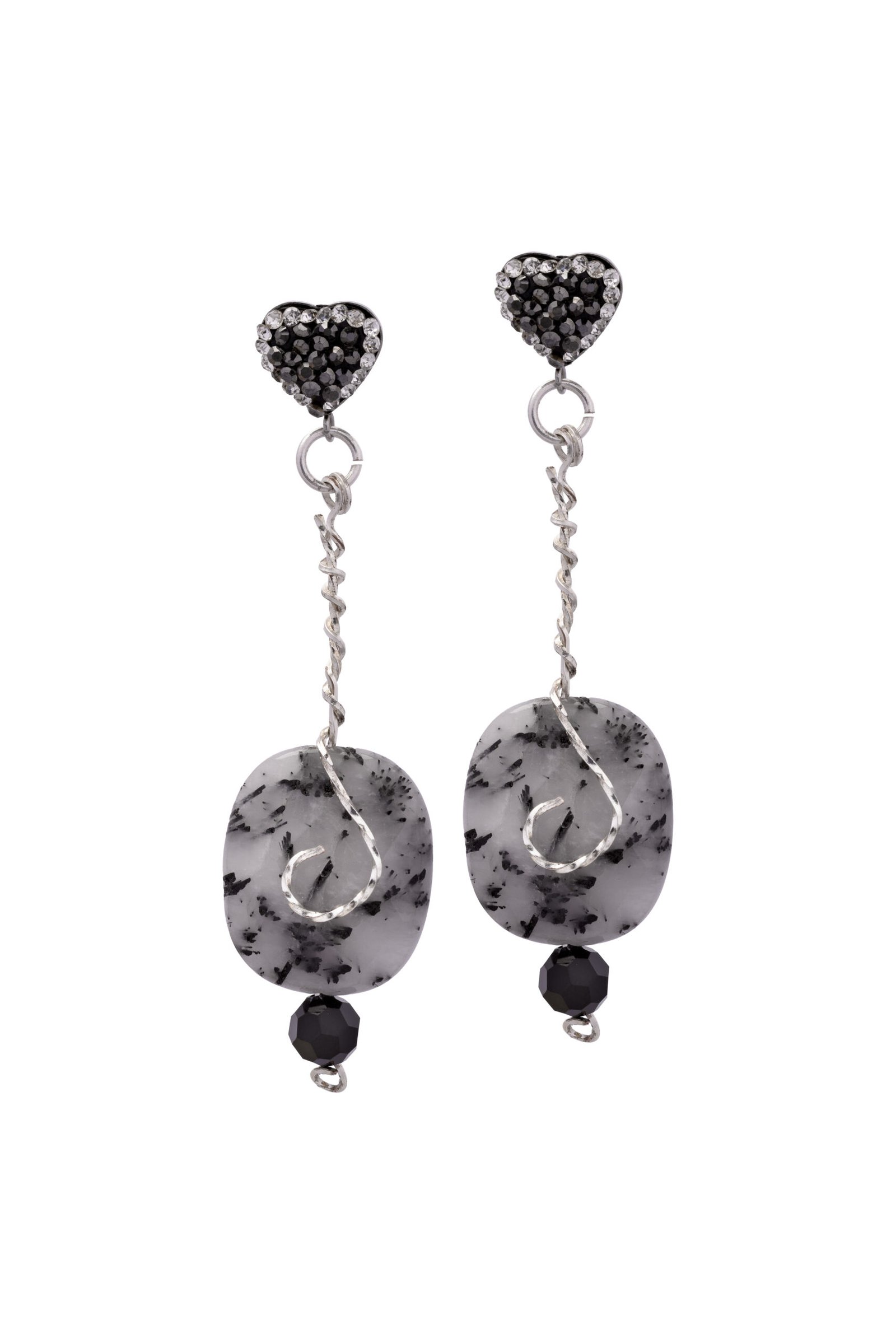 Λαμπερό καρφί σε σχήμα καρδιάς από Swarovski καταλήγει σε μαρμαροειδή ημιπολύτιμη πέτρα τυλιγμένη με ασημένιο σύρμα, δημιουργώντας εντυπωσιακά κρεμαστά σκουλαρίκια.