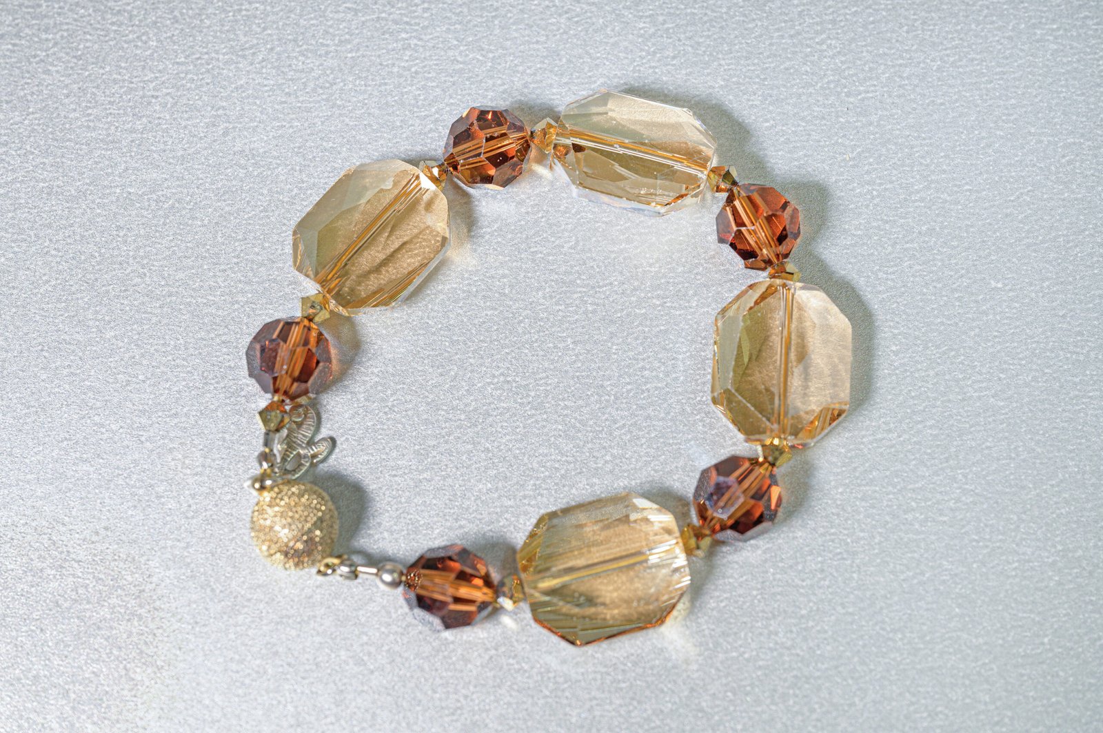 Κομψό βραχιόλι που συνδυάζει κρύσταλλα Swarovski σε αποχρώσεις σαμπάνιας και κεχριμπαριού σε διάφορα μεγέθη και κοπές.