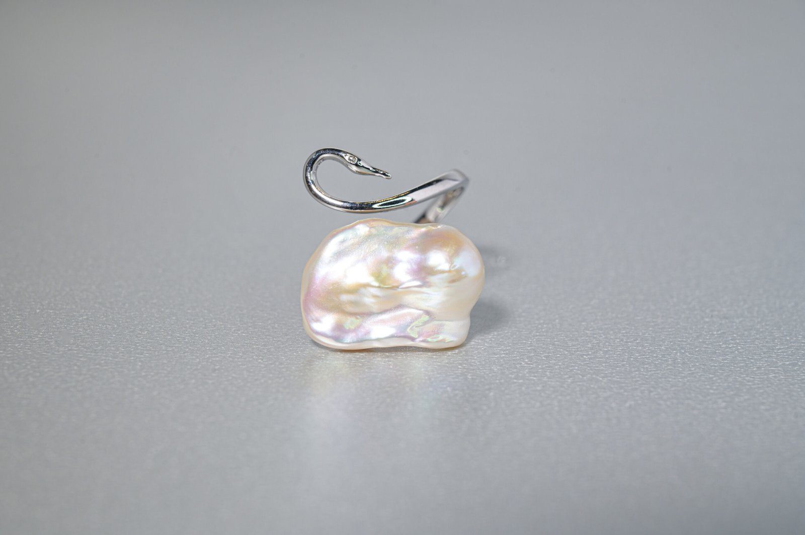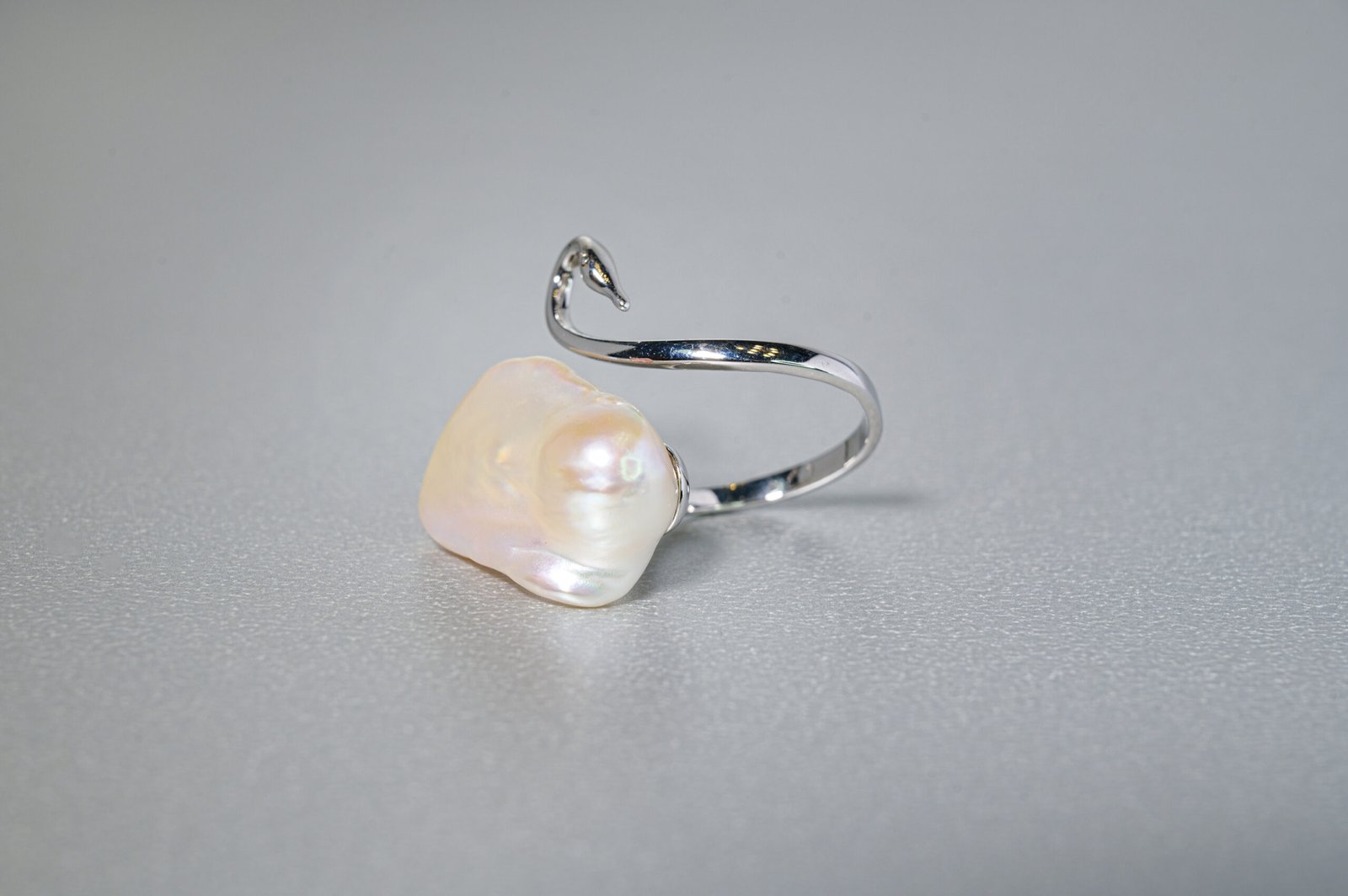 Ευέλικτο δαχτυλίδι με μαργαριτάρι μπαρόκ με ιριδίζουσα επιφάνεια, αγκαλιασμένο από ανοικτή ασημένια μπάντα που καμπυλώνει σαν κύκνος, συμβολίζοντας αγνότητα και μεταμόρφωση.