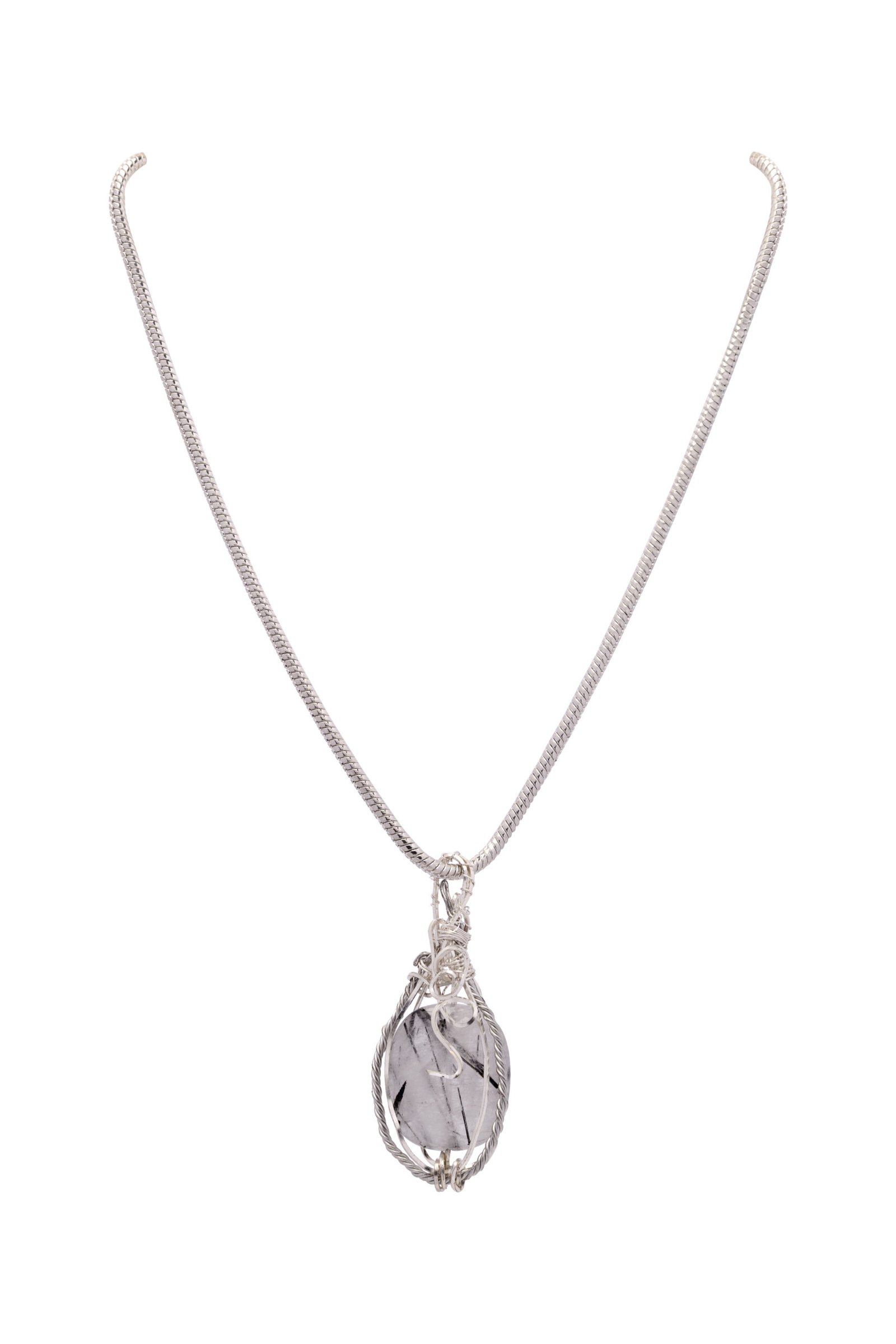 Το κολιέ διαθέτει αλυσίδα από ανοξείδωτο ατσάλι 925 και περίτεχνα συρμάτινα στροβιλίσματα από ss που αγκαλιάζουν τον κρύσταλλο χαλαζία.